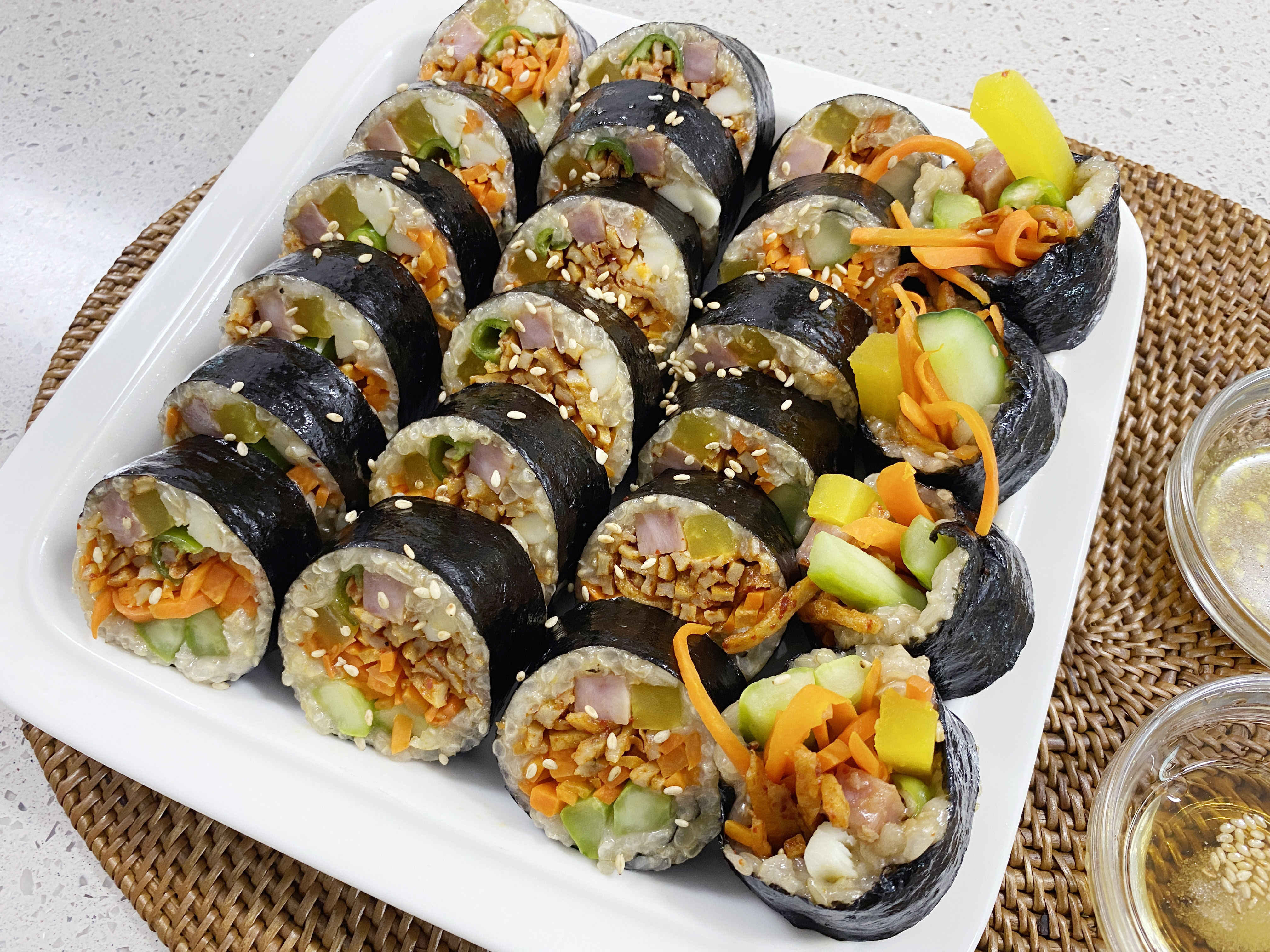 계란햄김밥 재료(2줄) 밥 320g 혼합식초 2큰술(단식초) 김밥 김 2장 계란 3개 소금 한꼬집 쿠킹와인 1/2작은술 식용유 약간 얇은 햄 10장 오이 1개 1/ 소금 2개 설탕 1작은술 식초 1큰술 참기름 1큰술
