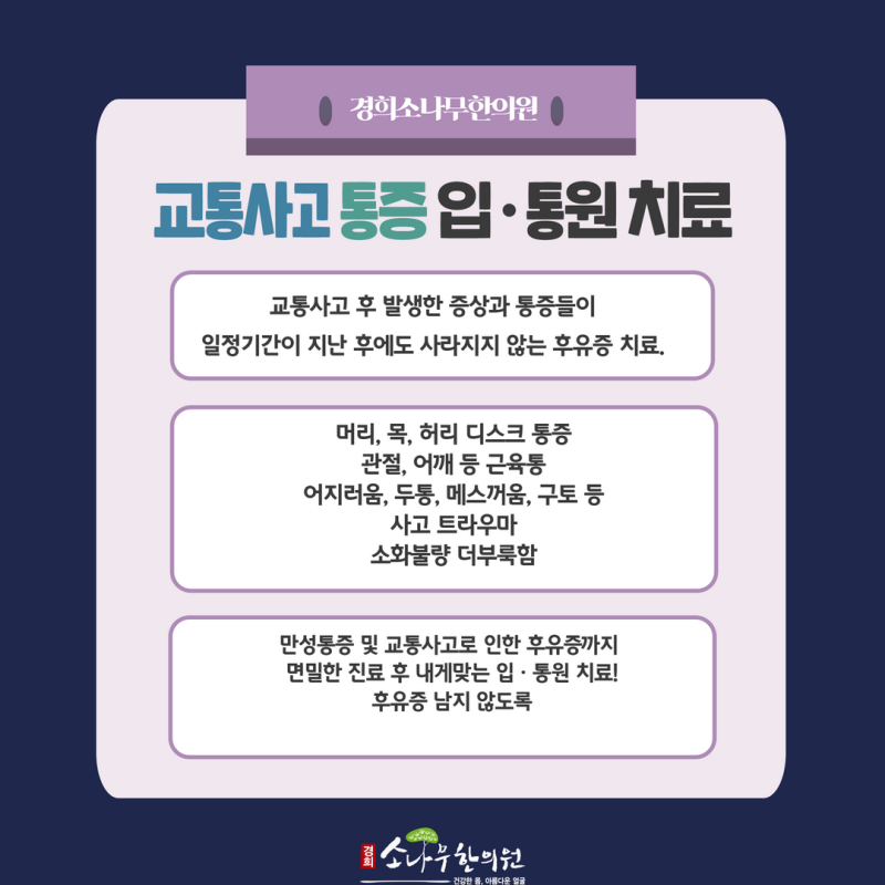 디스크나 목 디스크는 현대인에게 매우 친숙한 질환이 되고 있습니다.척추를 위협하는 대표적인 질환으로 통증의 강도가 매우 강합니다.과거에는 구조물과 조직의 변성으로 인해 노년층에 한정되어 나타나기도 하였으나, 현재는 젊은 층에서도 잘못된 현대식 생활습관과 또 교통사고와 강한 외부충격에 의해 발생하고 있어 주의가 필요합니다.주목해야 할 부분 ▼ 사고의 크기가 큰 교통사고에서만 통증이 나타나는 것입니까?경미한 사고라도 허리디스크가 발생할 수 있기 때문에 작은 사고라고 해도 과언이 아닌 후유증에 대비해야 한다고 경산 에스한의원은 강조하고 있습니다.사고 당시에는 증상이나 큰 불편은 없을지도 모르지만 방심해서는 안 됩니다!차량 충돌로 인한 후유증의 특징으로 충돌 당시에는 별다른 불편감이나 통증을 느끼지 못하는 경우가 많습니다.운동 후 근육통이 최소 1일에서 2일 후 나타나는 지연성 근육통과도 비슷합니다.그러니까 지금 당장 괜찮다고 해서 경미한 충돌이라고 관리가 필요 없는 상태라고 할 수는 없다는 뜻입니다.나중에 다리 저림, 요통, 하지 근력 저하 등이 나타나 내원하시는 분들이 계십니다.교통사고 추간판탈출증 아래와 같은 증상이 나타날 수 있습니다허리 통증은 없는데 하체가 저려.한쪽 다리가 얼얼하다.다리에 힘이 쑥 빠지다.엉덩이와 골반 주위에 통증이 있다.요통이 계속된다. 하지방사통으로 보행장애를 동반한다.수술이 필요하지 않은 상황에서도디스크가 탈출했다고 해서 꼭 수술을 해야 하나 고민이 됩니다.일부는 보존적인 방법만으로는 개선이 어렵지만 대부분의 허리 디스크의 경우 비수술 치료를 통해 회복이 가능합니다.방법은 다음과 같습니다.1인실, 2인실을 운영하는 입원실에서 후유증 관리를 지속할 수 있도록교통사고 후유증은 최소 며칠에서 길게는 몇 주에서 한 달 이상 잠복기를 갖게 됩니다.당일이 아니더라도 이후 얼마든지 증상이 나타날 수 있으며 제때 관리하지 못하고 방치하면 체내에 쌓인 어혈이나 노폐물로 인해 염증이 더욱 악화되고 상태가 나빠질 수 있습니다.따라서 상태가 그리 심각하지 않은 경우 통원보다는 입원실을 통해 집중적으로 꾸준히 관리를 해 나가는 것이 회복에 도움이 됩니다.통원의 경우 간혹 나타나는 증상에 대해 즉시 대처하기 어려운 점이 있고, 자기적으로도 한계가 있으며 생활 속에서도 관리에 집중하기 어렵다는 단점이 있으므로 보다 빠른 일상 회복을 위해서는 이러한 방법을 고려하는 것이 좋습니다.요통, 방사통 경산 S한의원에서는 이렇게 관리하고 있습니다.개인실과 2인실을 운영하고 있는 경상에스한의원에서는 침치료 온열요법 한약의 부항견인 치료 무중력 감압기 등을 통해 통증의 불편함과 질환의 실질적 원인이 되는 부분을 찾아 개선시키고 있습니다.허리디스크 증상의 바깥쪽에서만 관리해서는 안되며 내부적인 요소까지도 파악하여외부에서 강하게 전달된 충격에 의해 몸에서는 미세한 출혈이 발생하게 됩니다.배출되거나 흡수되는 것이 정상이지만 그렇지 않을 경우에는 어혈이라는 핏덩어리가 형성되어 혈액순환과 신진대사를 저하시켜 체내 염증을 유발하고 통증을 유발합니다.차량 사고로 초래된 허리 디스크라면 통증 관리는 물론 혈액 관리도 병행돼야 보다 원활한 회복과 다시 반복될 확률을 감소시켜 나갈 수 있습니다.그래서 체질별로 따른 한약 처방도 나오고 있습니다.무중력 감압기 치료기를 보유한척추 디스크 압력을 무중력 상태로 형성하는 기술이래요.목과 허리의 불쾌감을 관리할 수 있는 기계가 도입되어 후유증이나 통증에 더 긍정적인 반응을 얻을 수 있습니다.침과 온열 및 약침을 이용하여 허리 주위에 발생한 염증이나 붓기, 통증을 진정시키고 하지방사통이 심해지지 않도록 신경손상을 회복할 수 있도록 케어를 진행하고 있습니다.생활 속 케어 방법 Tip허리디스크는 회복되더라도 생활 속에서 제대로 관리하지 않으면 금방 다시 반복될 수 있습니다.그렇기 때문에 잘못된 부분을 바로잡는 것이 관리 방법 중 가장 기본입니다.허리를 지탱하고 있는 척추뼈 주변의 근육과 인대를 강화해 나가야 합니다.꾸준한 운동과 스트레칭을 실시하고 허리를 비틀거나 다리를 비틀거나 한쪽 다리를 꼬집는 등 잘못된 자세는 피해야 합니다.의자에 앉을 때는 엉덩이를 등받이에 끝까지 붙이고 앉도록 하고, 잘 때는 바로 눕는 자세가 좋습니다.척추에 부담이 가지 않는 수영이나 산책 등은 체중 부담이 적은 편이므로 꾸준히 하는 것이 좋아요.교통사고 후유증, 허리디스크, 이제 두려워하지 마세요!경산 S한의원이 함께 합니다교통사고 후유증, 허리디스크, 이제 두려워하지 마세요!경산 S한의원이 함께 합니다교통사고 후유증, 허리디스크, 이제 두려워하지 마세요!경산 S한의원이 함께 합니다교통사고 후유증, 허리디스크, 이제 두려워하지 마세요!경산 S한의원이 함께 합니다