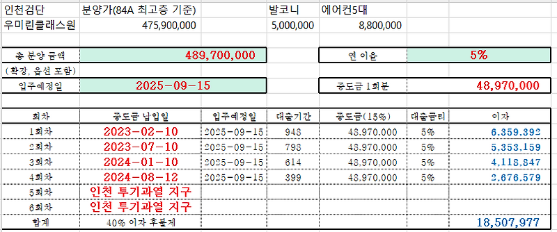 공개일은 15일을 기준으로 하며, 공휴일인 경우에는 그 다음날을 기준으로 합니다. 그러면 예를 들어 현재 COFIX 6개월 변동금리가 4월 15일 기준 1.7%라면 4월 20일 현재 COFIX 6개월 변동금리는 1.72%(이자율) = 4.3%가 됩니다. 그렇다면 금리는 4.3%에 머물 것인가? 습관. 중기상환대출은 5~6회차로 나뉘며, 회차별 금리는 날짜에 따라 차등적용됩니다. 그러나 통계적 목적을 위해 시중에서 판매되는 대부분의 중도금 대출 계산기(Excel 파일)는 첫 번째 지불 금리를 계산합니다. COFIX 금리가 6개월마다 0.1%씩 상승한다고 가정하면 4월 15일 1차(10%) : 1.7+2.6%=4.3%(4월 15~10.15) 8월 15일 2차(10%) : 1.8 +2.6%= 4.4% (8.15~2.15)