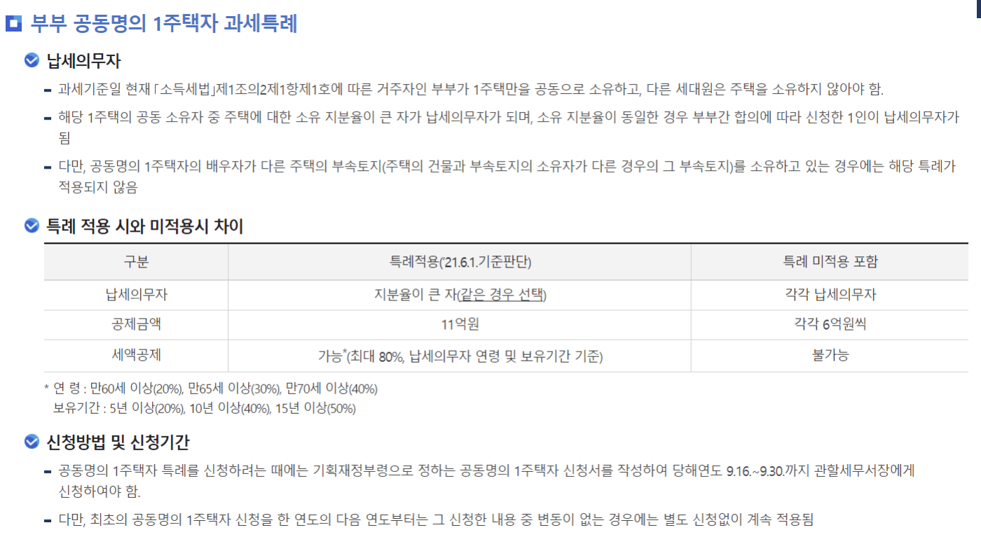 부부가 각각 6억원씩 공제신청을 하는 경우 부부가 합산하여 11억원으로 공제신청을 하는 경우 두 공제의 합산한도는 총 80%입니다. 고령자 및 장기보유세액공제를 일정 수준 이상으로 받게 되면 공동명의보다 단독명의가 유리할 수도 있습니다.부부 공동 명의 특례 신청현재 종합부동산세의 경우 세액공제는 다음과 같습니다.만 60세 이상~만 65세 미만: 20% 만 65세 이상~만 70세 미만: 30% 만 70세 이상: 40% 또한 보유기간인 경우 세액공제는 다음과 같습니다. 5년이상~10년미만:20% 10년이상~15년미만:40% 15년이상:50% 주택구입시 부부공동명의인 경우 6억원+11억원공제 or 6억원공제의 선택이 가능하오니 유리한 쪽에 맞게 신청을 해주시기 바랍니다. 4. 부부공동명의주택 특례신청방법국세청 홈택스 홈페이지에 접속하여 신고/납부=>일반신고=>종부세 부부 공동명의의 1주택자 특례신청을 합니다.국세청 홈택스위에 누르시면 종부세 부부 공동명의의 1주택자 특례신청이 있는데 여기서 간이세액 계산이 가능합니다. 즉, 본인의 조건에 따라 미리 계산을 해볼 수 있습니다.이하의 간이세액 계산을 해 보았습니다.주택의 가격은 15억원이라고 가정할 때 단독주택과 공동명의의 세금은 다음과 같습니다.1주택자로서 11억원을 공제받은 후 공정시장가액비율 60%를 계산하여 세액공제에 따른(보유기간 및 연령)을 하면 11억원 공제+세액공제 적용에서는 1209,600원입니다.또 공동명의의 1주택자 특례 미적용(각각 6억원씩 공제, 세액공제 없음)을 하는 경우는 737,100원입니다.공동명의 계산위 표를 보면 6억씩 나눠서 신고하는 것이 세액 부담이 적기 때문에 유리합니다.이상 부부 공동명의 종합부동세 절세효과 및 1주택자 특례신청 방법에 대해 정리하였는데 도움이 되셨으면 좋겠습니다. 오늘도 좋은 하루 보내세요.#부부공동명의종합부동산세 #부부공동명의종합부동산세 #종부세1주택자특례 #1주택자종합부동산세 #종부세