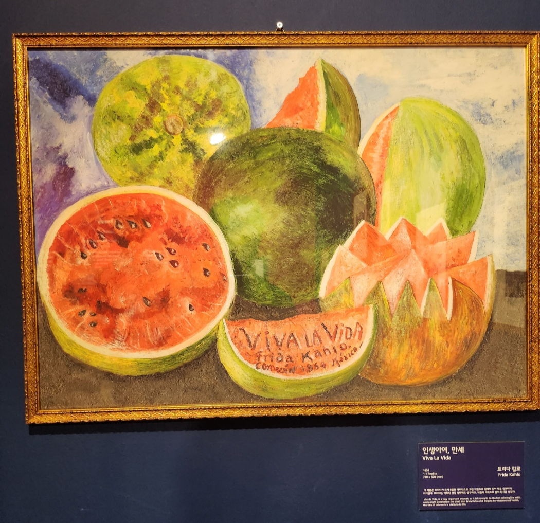 멕시코에서는 수박이 매우 대중적이고 대중적인 과일이라고 합니다. 겉은 단단하지만 달고 시원한 과일이 가득 들어 있어 멕시코인들이 가장 좋아하는 과일. 프리다 칼로는 죽기 전에 하고 싶은 말을 수박에 새겼다. 고통과 사랑, 혁명으로 가득 찬 그녀의 삶의 마지막 메시지