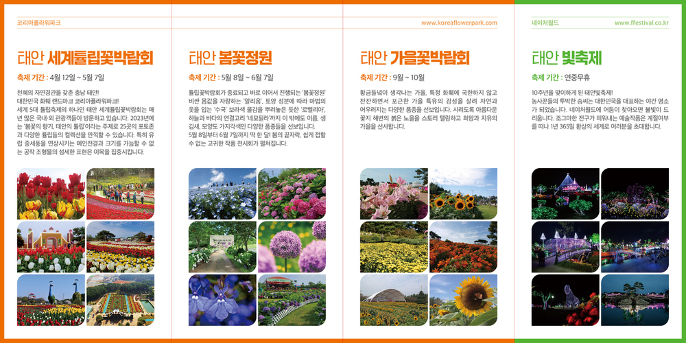 태안 코리아 플라워 파크 4월 세계튤립꽃박람회, 5월 태안 봄꽃축제, 가을 가을꽃박람회그때까지 웅장하고 아름다운 동화의 나라는 계속된다. 그리고 밤에는 태안네이처월드에서 태안빛축제도 열린다.
